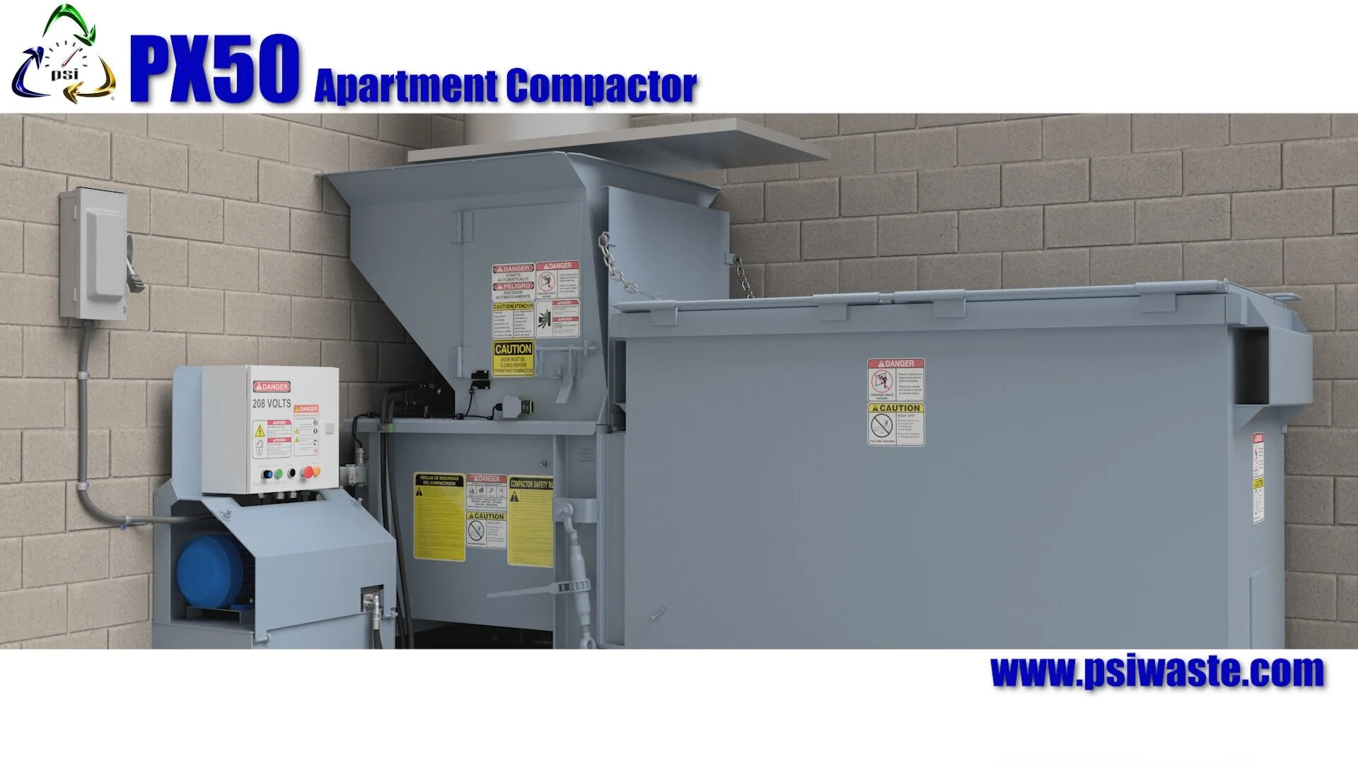 The PX75 is a chute-fed apartment compactor featuring twin cylinders in a cross configuration, offering increased clear-top access while maintaining the same width as the PX50. It’s ideal for 36” chutes and is available in multiple configurations to suit a variety of building layouts: